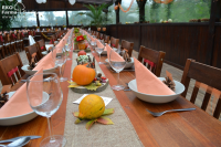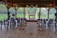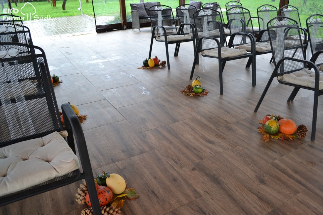 Tuto svatbu doprovázelo typické podzimní počasí, které výjimečně nevadilo a naopak podpořilo atmosféru celého dne. Svatba byla laděna do oranžové barvy, kdy svatební tabule byly zdobeny všemi druhy dýní společně s dřevěnými doplňky. Obřadní pergola byla vyzdobena barevným listím a taktéž svatební ulička byla podél zdobena barevnými dýněmi. Celá svatba navzdory počasí působila teple a příjemně, díky výzdobě a oranžovému nasvícení.