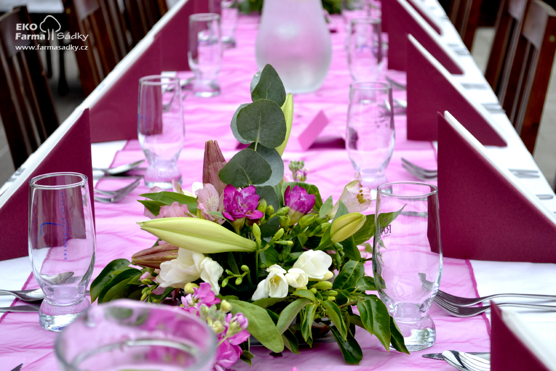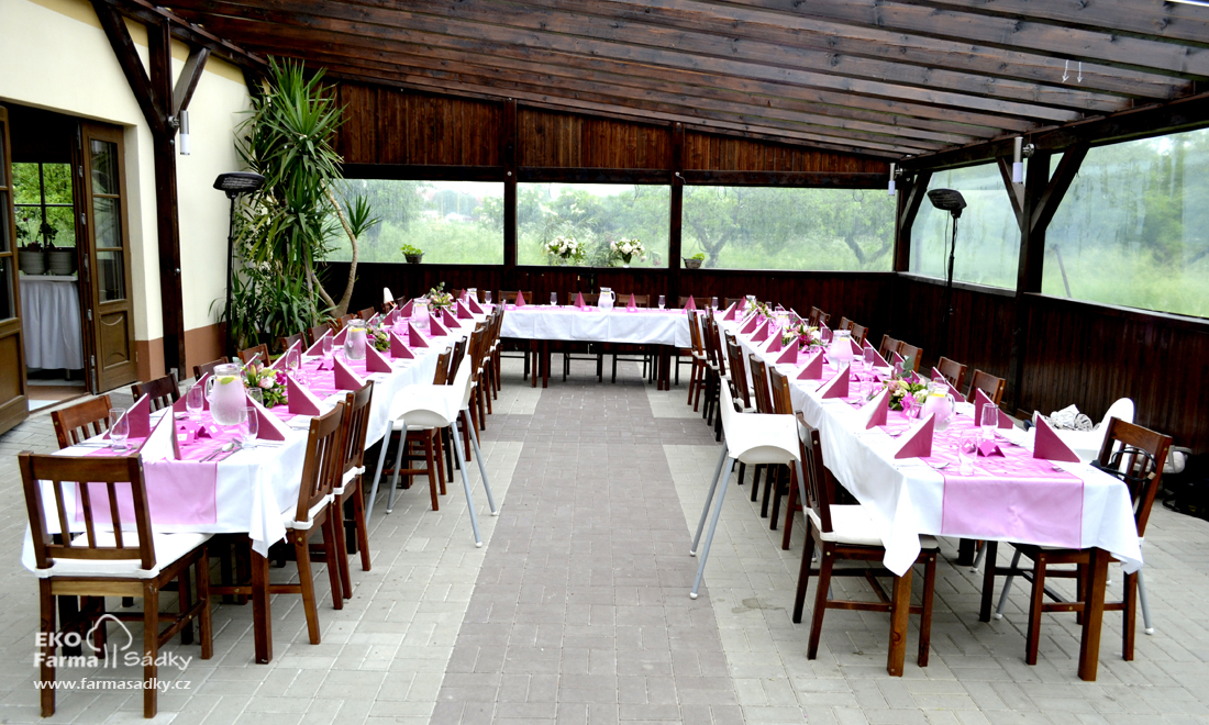 Milá svatba, která i přes velkou nepřízeň počasí dopadla dobře. Když se schylovalo k obřadu, začala obrovská průtrž mračen. Bylo tedy jasné, že se obřad nemůže uskutečnit pod meruňkami, jak bylo původně plánováno, protože v tak hustém dešti by venku nešlo stát ani s deštníkem. Muselo se tedy najít náhradní řešení, a proto obřad proběhl pod pergolou. Přestože se celý sváteční akt odehrál v nouzových podmínkách, neubralo mu to nic na vážnosti, ba naopak byla celé situaci dodána opravdovost. Celá dekorace byla laděná do fuchsiové barvy a doplněná krásným aranžmá květin.