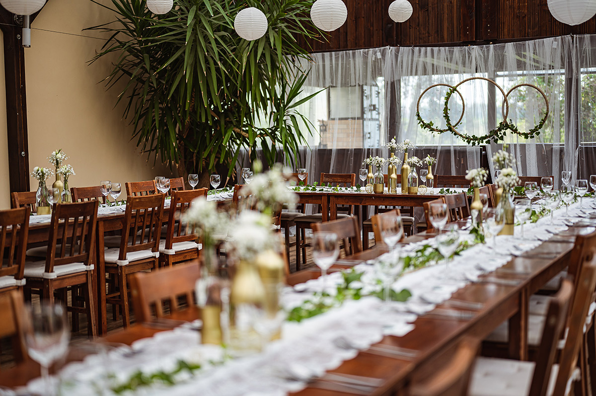 Vlastní: Krajkový běhoun, živé květy, zlaté vázičky, břečťan, lampiony, svíčky, krajkové závěsy, tabule do U, rumový koutek, aperol a gin koutek, závěsná dekorační kola, odpočinková zóna, sladký bar |