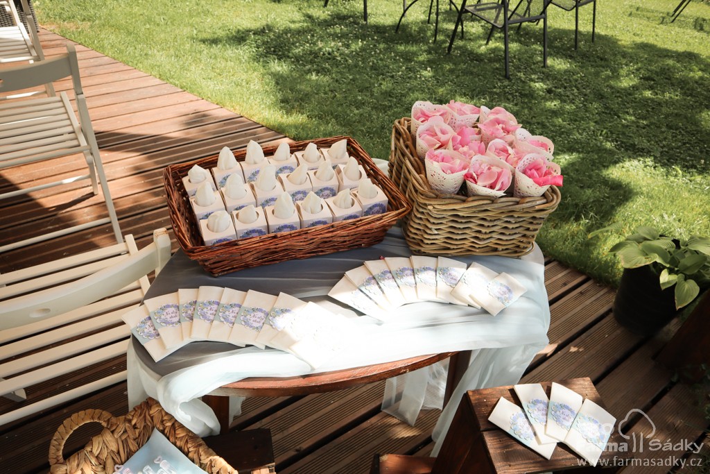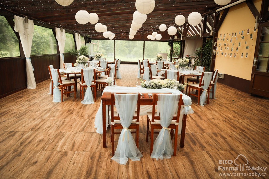 Ekofarma Sádky Kunovice:kulaté stoly, světle modrý šifon, živé květy, plovoucí svíčky, zlaté kulatiny, záclony v oknech, šifon na židlích, lampiony, zlaté kulatiny, zlatý kruk k obřadu, sladký bar, stolek na slzy štěstí, |