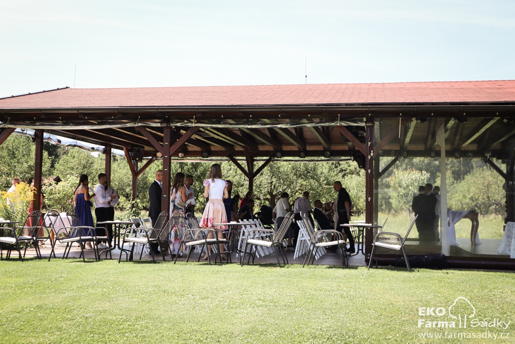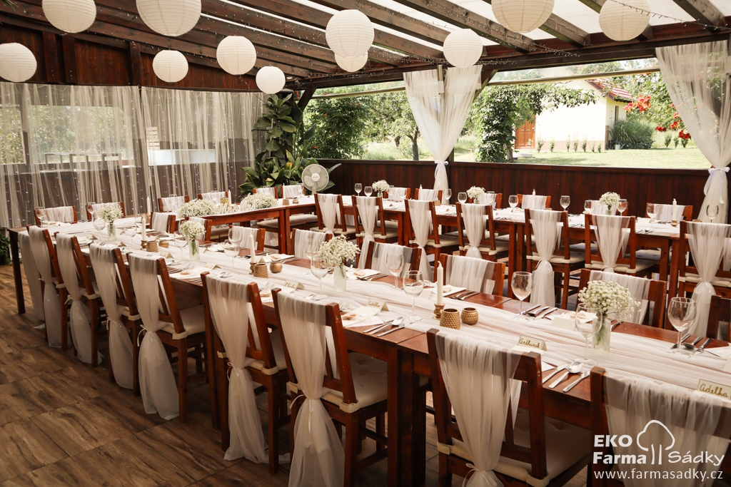 Ekofarma Sádky Kunovice: tabule do U, bílý šifon, nevěstin závoj, šifonový závoj na židli, svíčky, lampiony, barokní stolek s květy k obřadu, stolek na slzy štěstí, sladký bar, gin tonic bar, odpočinková zóna, limo bar |